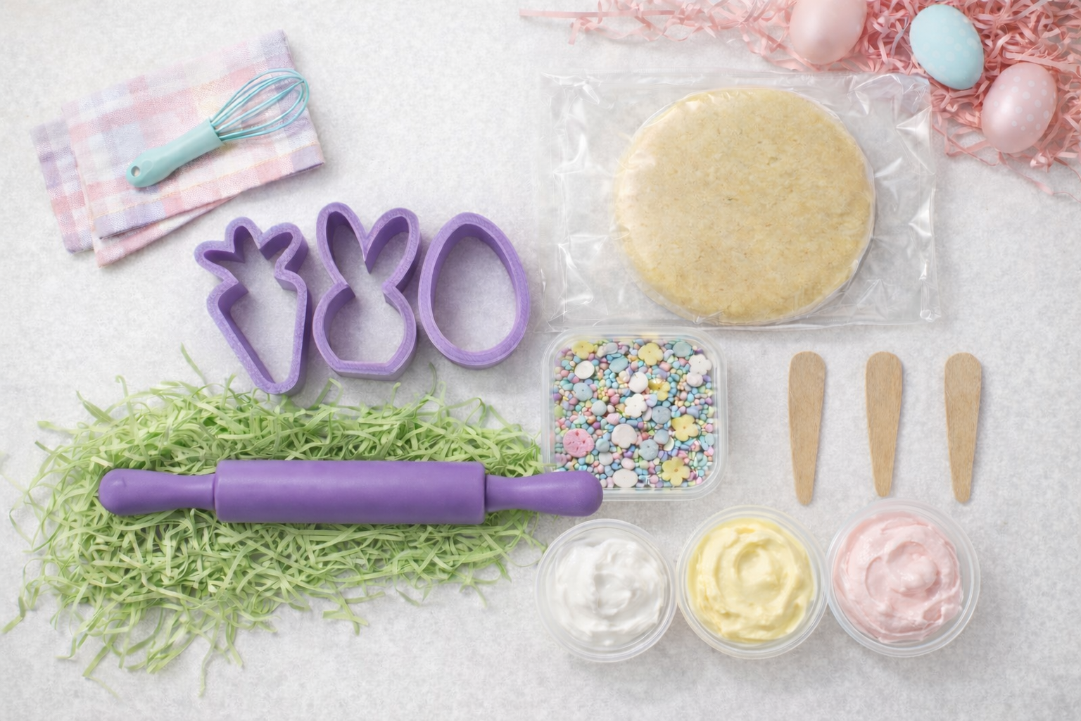 Each kit includes our signature vanilla cookie dough-generously portioned to make 12 beautiful Easter-shaped cookies. Have an adult knead the dough once out of the vacuum sealed pouch. Inside every kit you will find:
