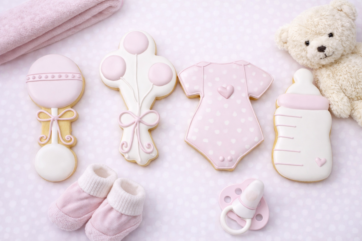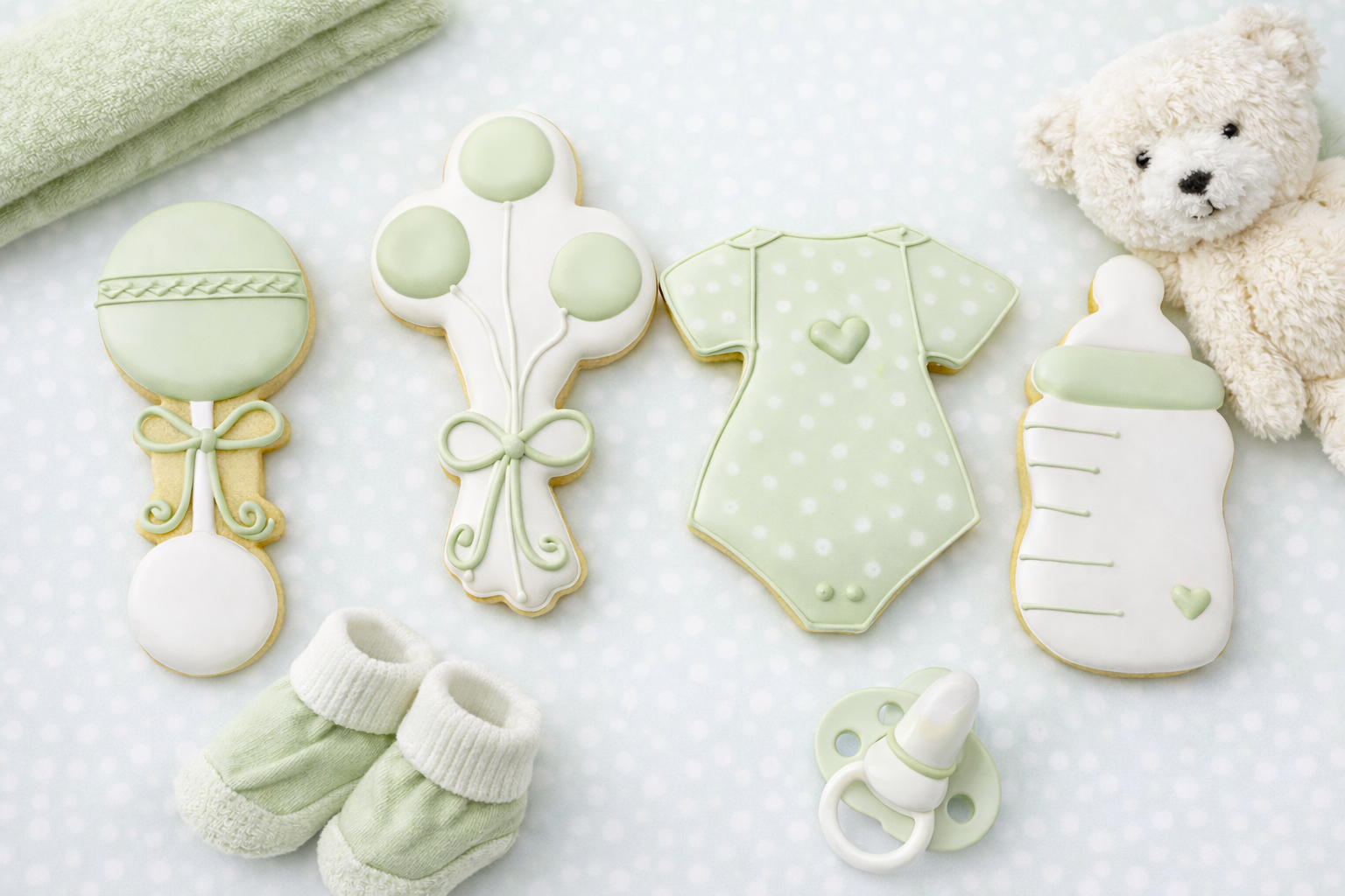 This set is perfect for simple, elegant baby showers. The Sweet Beginnings Collection features pre-designed cookies; are offered in a classic pink , blue, or soft green neutral colour palette selected at the time of ordering. Designs, colours, and layout are thoughtfully chosen and will be created exactly as shown. $49/set of 12 cookies